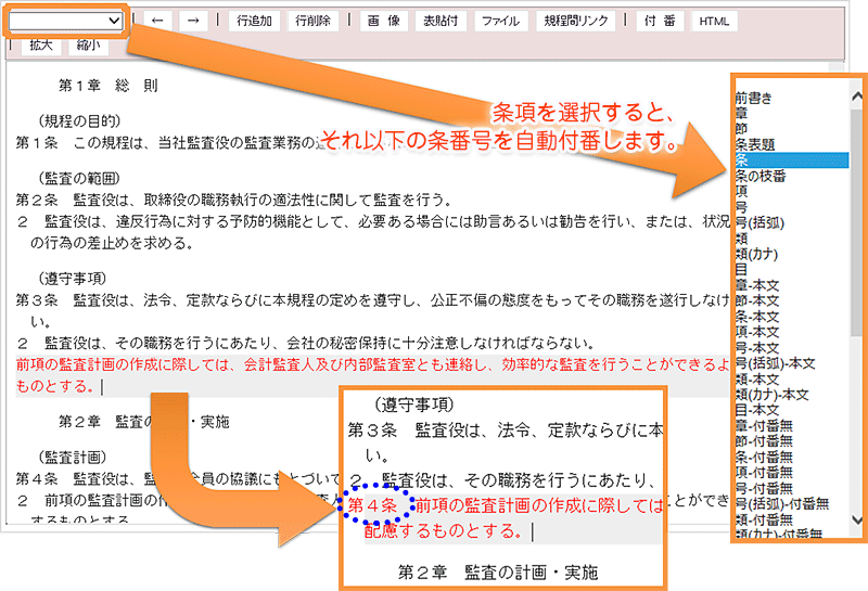 ・条文追加、削除に伴う条項番号の自動付番