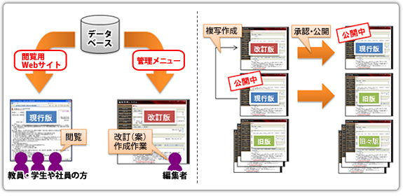 規程管理システムは、各種規程の編集・改定・履歴・廃棄までを迅速かつ容易に実行でき、歴代の版管理はもちろん、新旧対照表の自動作成、ブラウザでの閲覧にも対応した画期的なシステムです。